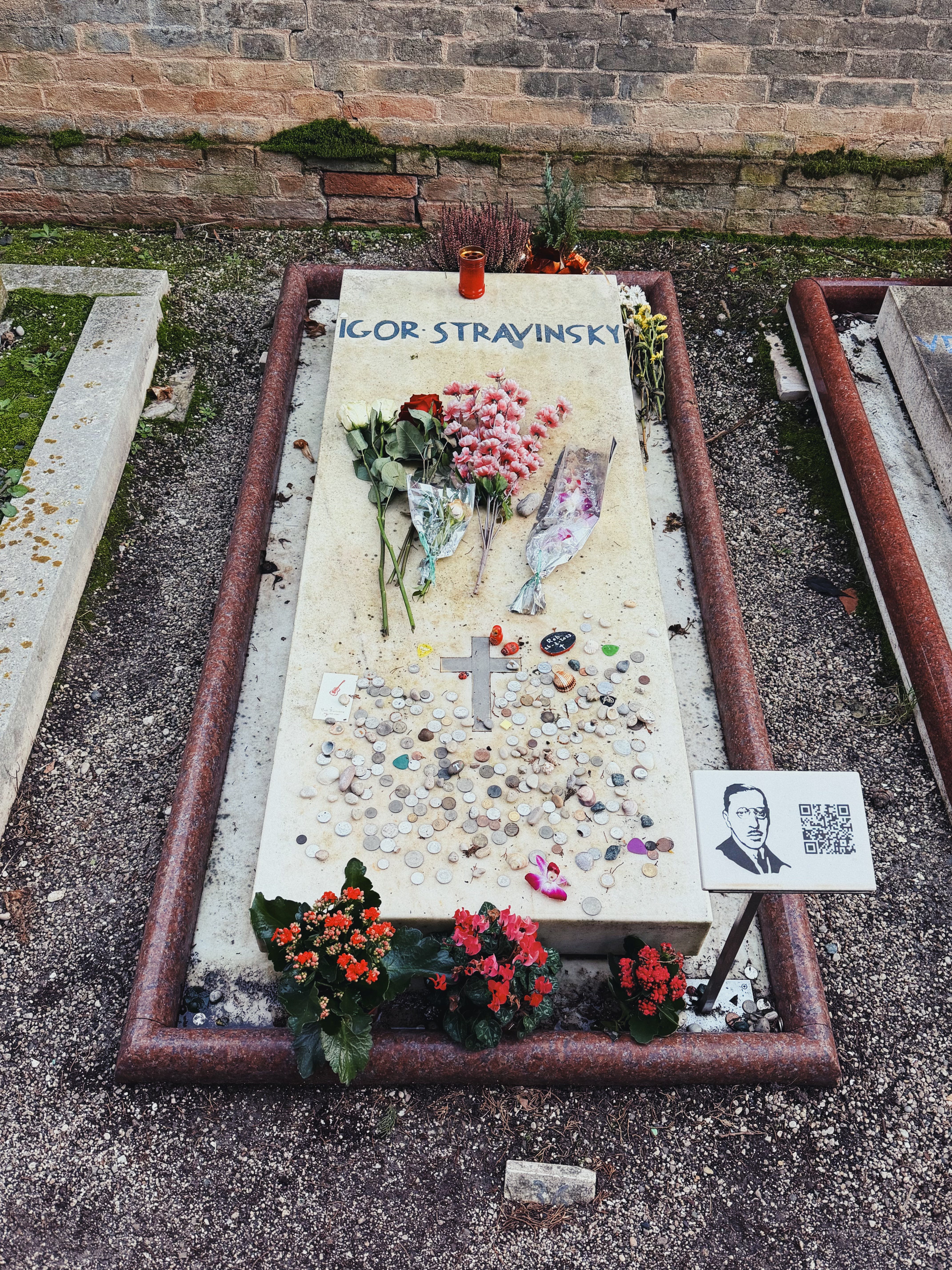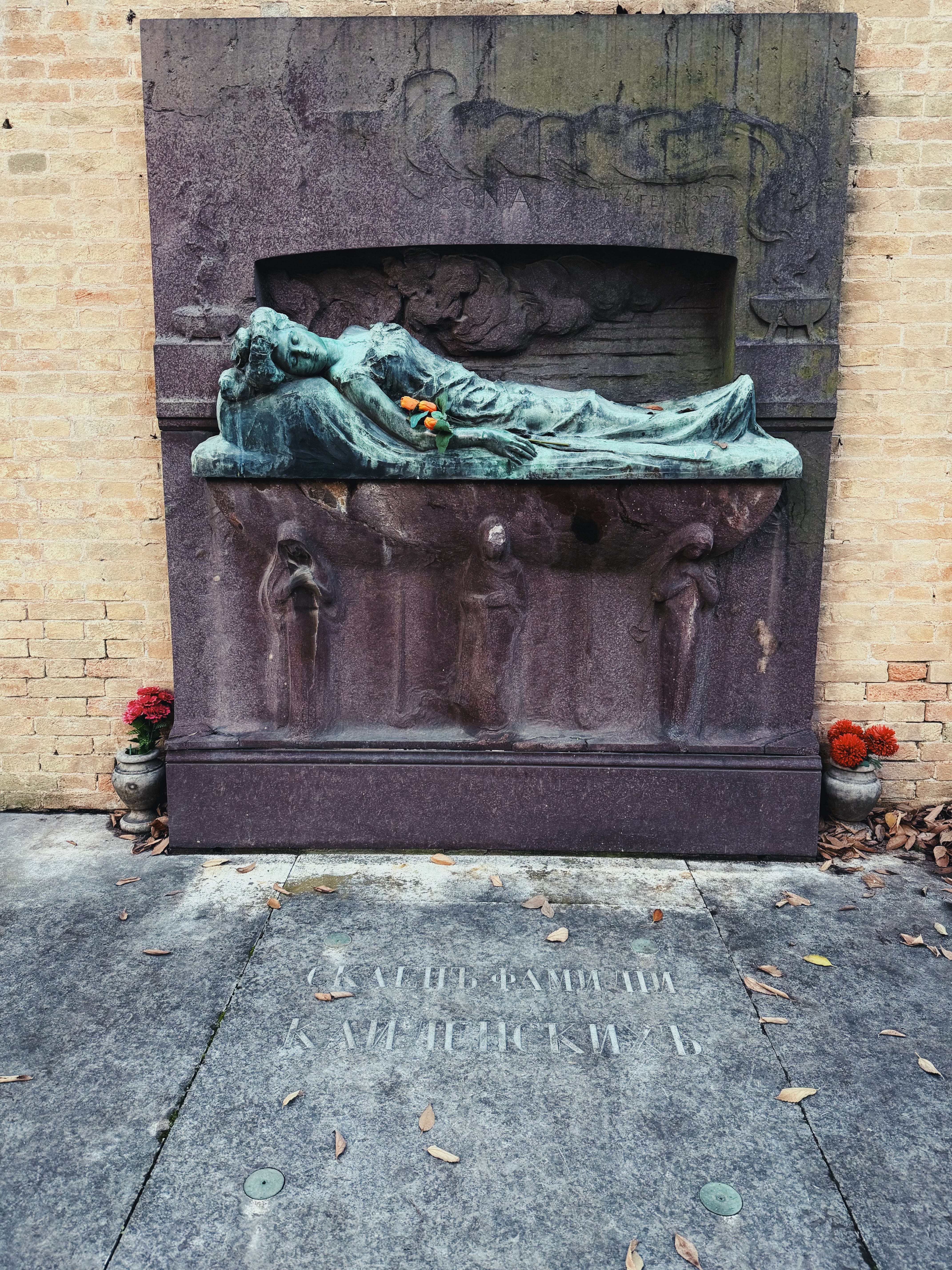 I scramble for directions online; I keep going the wrong way. Ten minutes left. Seven. I find the Russian section — here’s Stravinsky, my favourite composer, along with his wife. Here’s Diaghilev, whose ability to live with such gusto I so admired when reading his biography. Here is a beautiful statue of resting Sonia, a bouquet of fresh tulips resting atop — who is she? Do the descendants of this noble family still live in Venice, or at least visit?