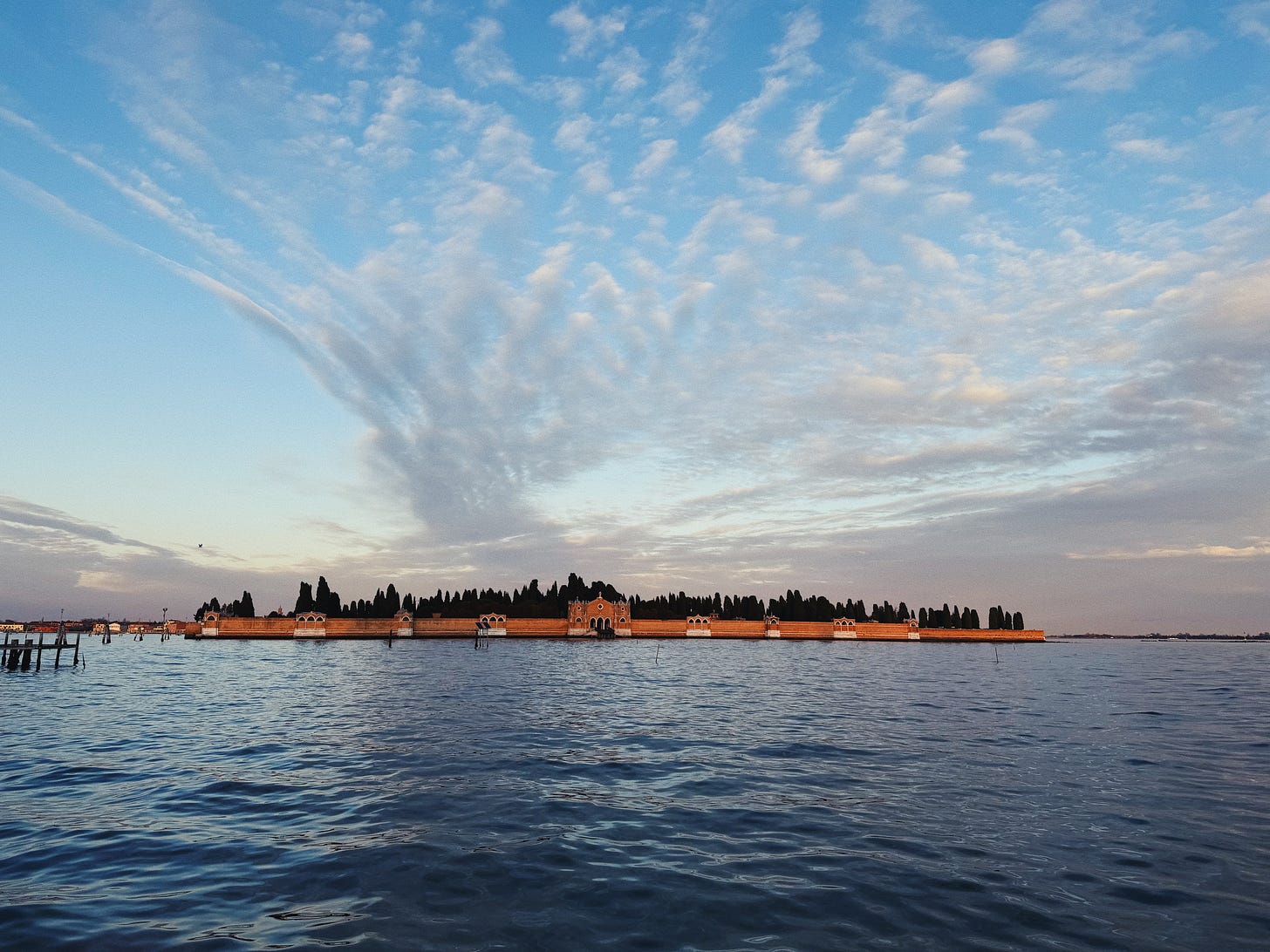 I catch the boat and arrive at the island of the dead at ten minutes past four in the afternoon. The cemetery closes at half past, and as I race through the combed paths between the graves, sharp stones crunching under my shoes, trying to locate Brodsky’s, the loudspeaker announces that I should be making my way to the exit. The pin on Apple Maps is wrong. I cannot find the grave. I wonder what will happen if I’m late to the gate — will they lock it, throw the big key in their backpack, and set off on the last boat off the island, leaving me behind? Will I have to spend the night here, haunted by the ghosts of all those contained within this walled patch of land in the middle of the lagoon?