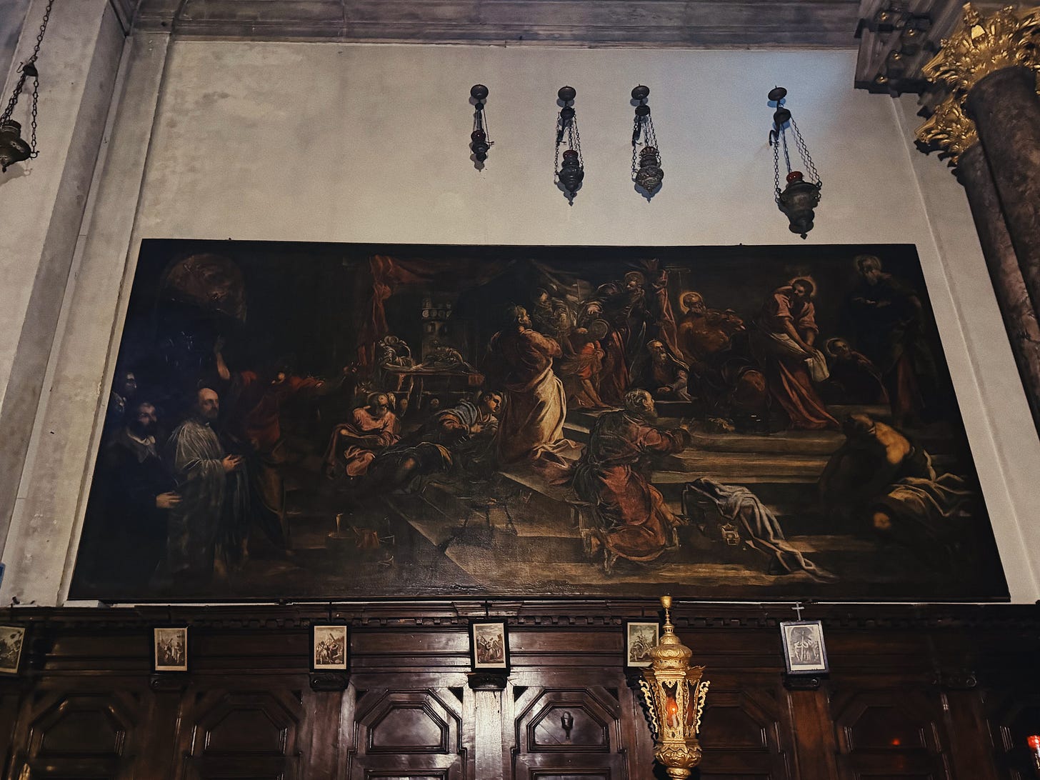 Whereas now, standing alone in Fortuny’s library, or in Peggy Guggenheim’s dining room, or in a random church I step into on the way back to the hotel — and see Tintoretto’s paintings hanging on the walls, not another soul there apart from myself and a bored guard who charges me 3.50 euro to get in — it feels entirely different.